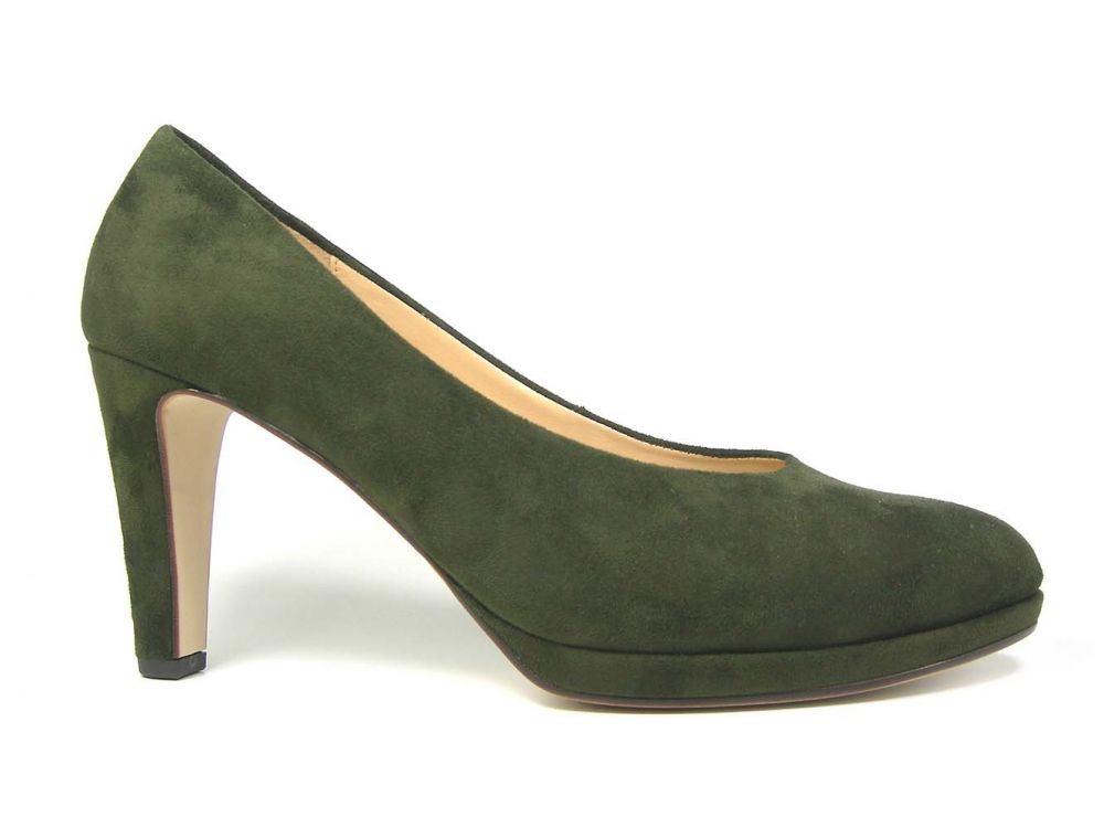 Pump met 7 cm hak. Olijf groen, synthetisch suede (microvelour).