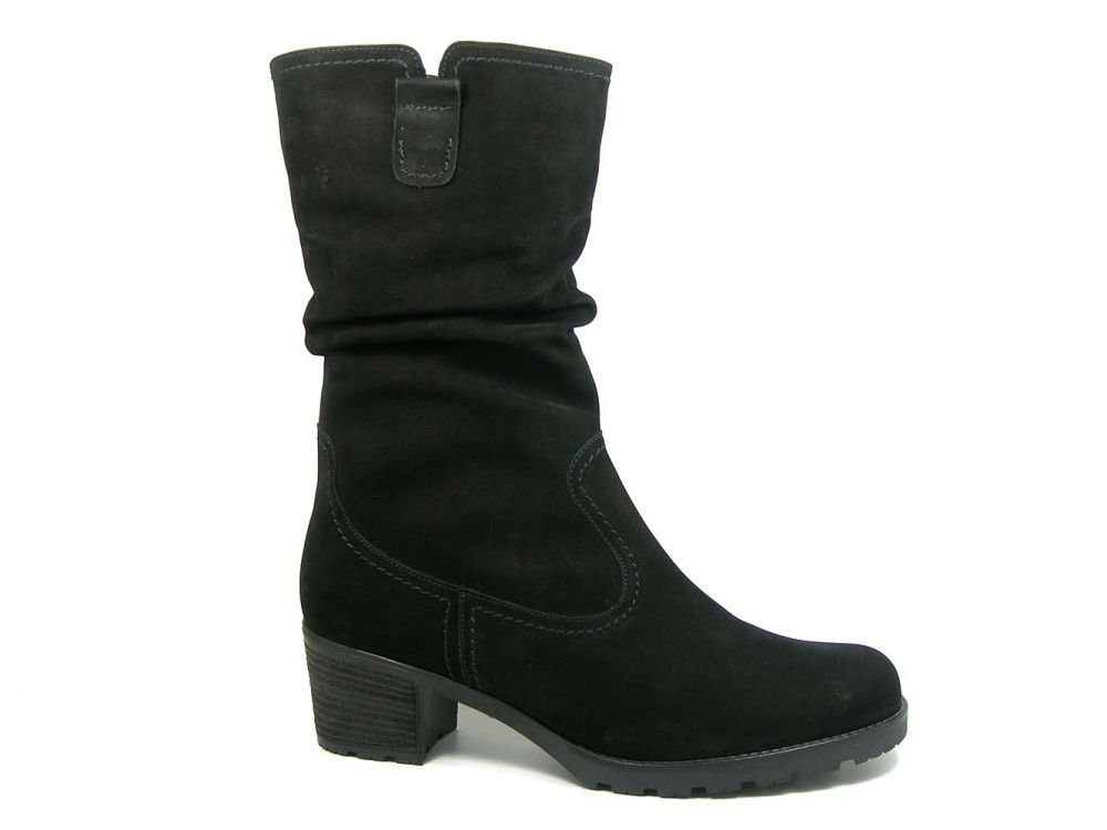 Gevoerde korte laars met 4½ cm hak, 26 cm schachthoogte en rits. G leest (= normaal). Zwart, nubuck. Artikel nr: 72.802-90