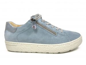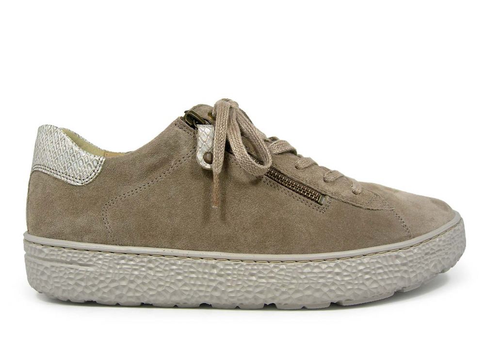 Veterschoen met rits en uitneembaar voetbed, comfortabele H leest (geschikt voor een normale tot brede voet). Beige met details in gold print, suede/ leer.