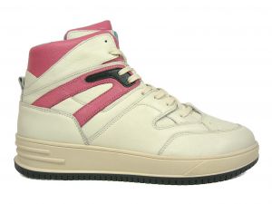Sportieve hoge retro-sneaker met dikke zool en uitneembaar voetbed. Comfortabele, brede leest. Beige suede, met roze tong en details in platina, leren voering.